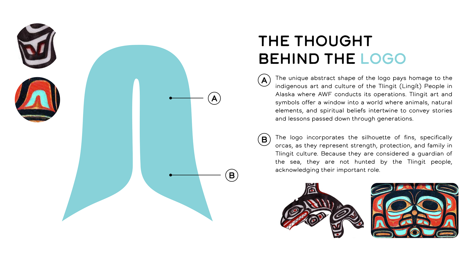 Inspired by the indigenous Tlingit (Lingit) People in Alaska, I aimed to create a rebrand that honors their art and culture. AWF conducts its operations on these indigenous lands and waters, ensuring that indigenous leaders are followed and respected as they work to decolonize and re-indigenize conservation science and ecosystem management. I believe it is vital to recognize the environmental efforts and management of indigenous tribes, as they have looked after their lands and waters for thousands of years. Therefore, I wanted to pay homage to Tlingit art and culture in this rebrand.