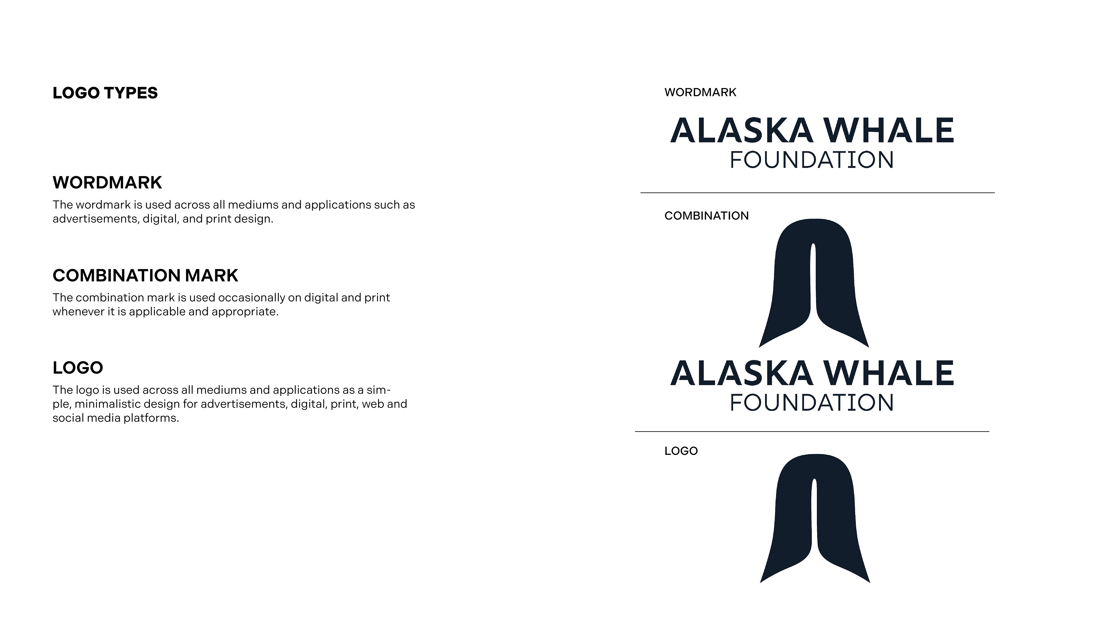 Redesign the Alaska Whale Foundation's brand identity to make it more memorable. This rebrand aims to appeal to younger audiences, encouraging them to become more environmentally conscious and advocate for our planet. Influenced by the indigenous tribe in the area, AWF honors Tlingit art and echoes its design elements throughout the rebrand.