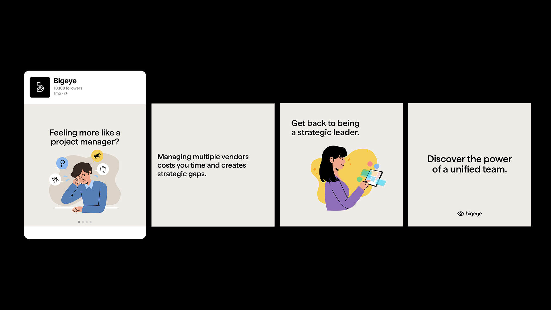 Contracted to develop a simple yet compelling LinkedIn ad campaign that includes single images and carousels, as well as business covers and personal headers, adhering to brand style guides.