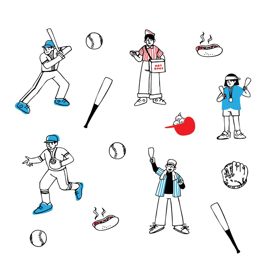 Simple yet playful illustrations and graphic elements that highlight baseball and fan culture.